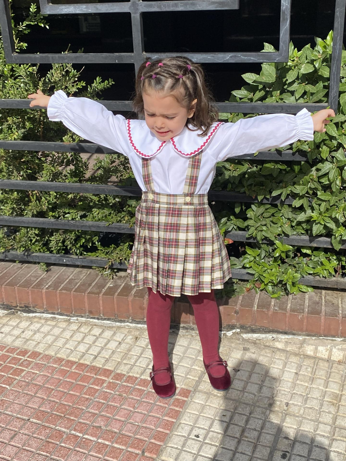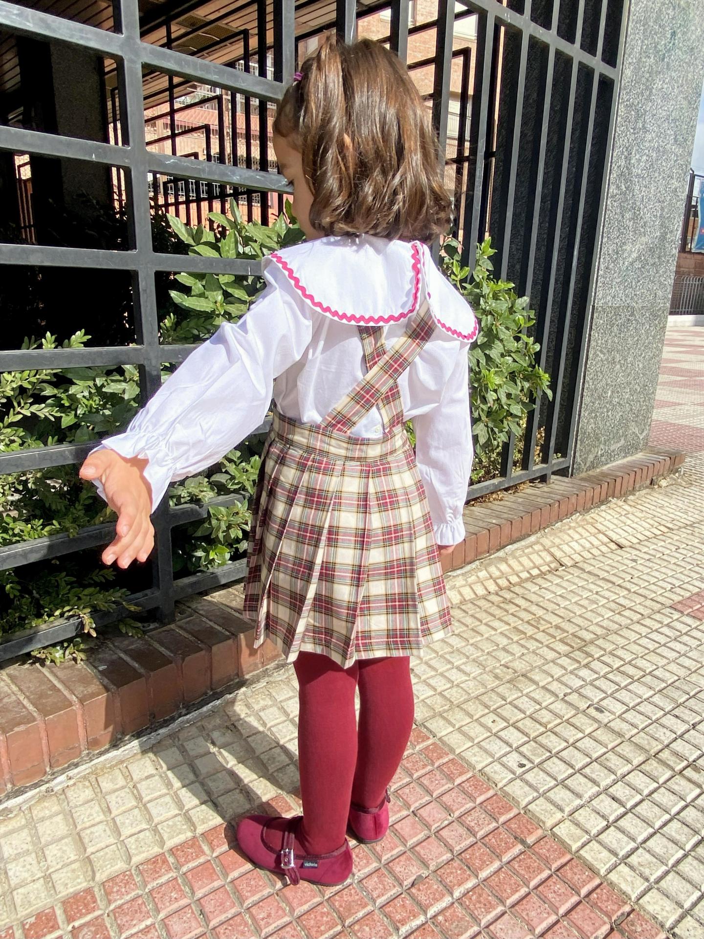 Nuestra falda de tablas en estampado tartán en todos burdeos y crema es la opción perfecta para las niñas. Se cierra con botón en cintura y cuenta con 2 tirantes que hacen de la misma una prenda muy especial.